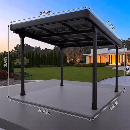 The design is specifically designed for extreme weather conditions and can withstand wind speeds of up to 35 m/s and a snow load of up to 1.1 kN/m². Certifications such as ISO 9001, CE, SGS and UL guarantee the highest quality and safety according to international standards. With a guarantee period of 10 years and a service life of around 25 years, this carport is ideal for long-term use in private and commercial areas.