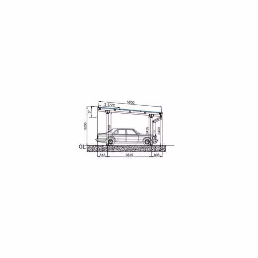 The roof offers space for 9 solar modules in a 3 × 3 arrangement. The dimensions per module are approx. 1722/1762 × 1134 × 30 mm. In combination with roof cladding and rain gutter, you can use your parking space twice as sensibly – as reliable weather protection and as your own energy source.