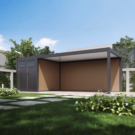 Strong and rust-free carport with equipment space from Weide, year-round protection for long cars.