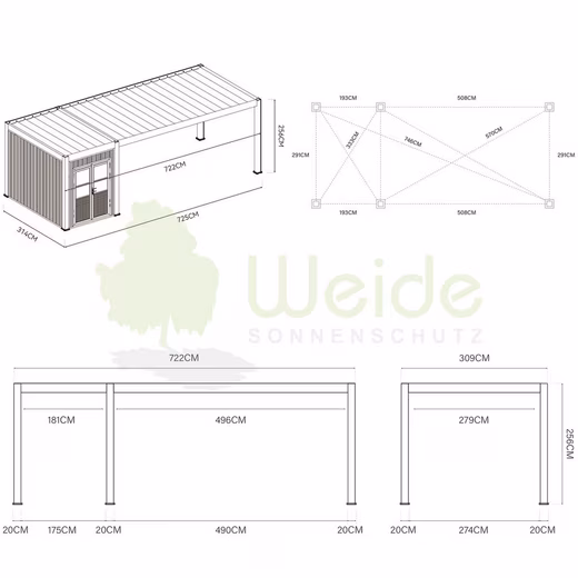 - Robust aluminum posts 150×150 mm and trusses 200x120mm.