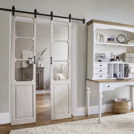 Romantic double doors made of pine and fir wood with an antique finish. Artfully framed glass inserts. Sliding on stable iron rail. This sliding door duo fits into a rustic alpine hut as well as into a Spanish finca or a cosy house and exudes a picturesque flair in any living ambience. The combination of fir and pine wood captivates with its unadulterated charm and its pretty antique finish. The wonderful doors can be moved back and forth on a solid iron rail. Depending on your interior and architecture, you can add additional rooms, booths or refuges to your home without having to put in a wall.