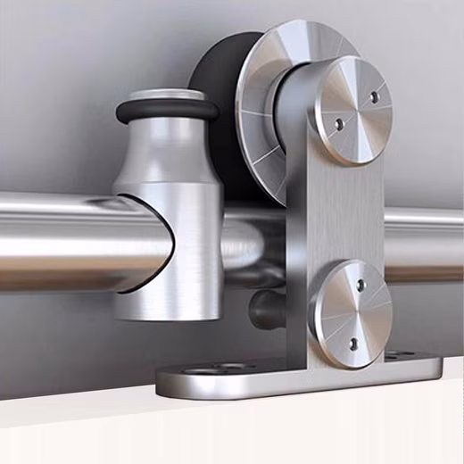 - Sliding door hanging system with a frameless door leaf, visible stainless steel hardware and stoppers