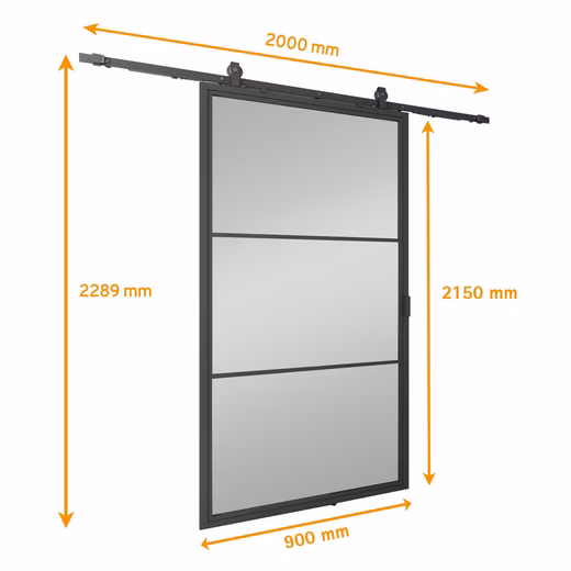 • Sliding door hanging system with a framed glass sliding door, visible steel hardware, black powder-coated
