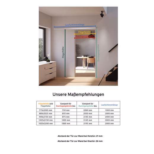 • Scope of delivery: 1 door leaf, 1 handle for the front, carriage, running rail, stopper, floor guide, mounting material, assembly instructions