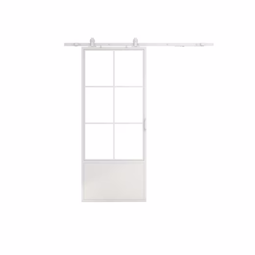 • Sliding door hanging system with a framed sliding glass door, visible steel fittings, white powder-coated