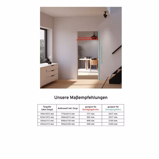 • Scope of delivery: 1 door leaf, 1 handle for the front, carriage, running rail, stopper, floor guide, mounting material, assembly instructions
