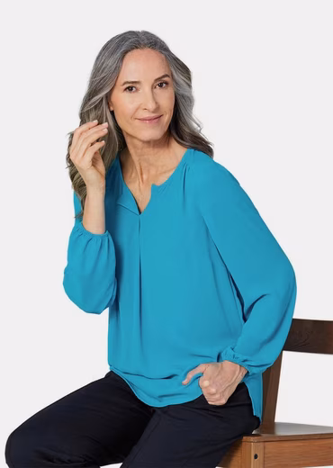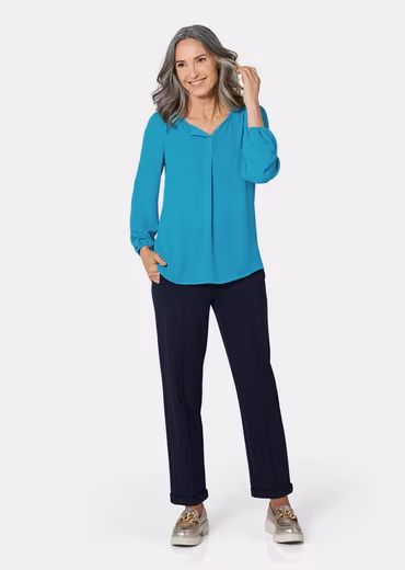 A feminine blouse with a concealed button placket in a finely flowing crepe fabric. A comfortable round neckline with a stretchy panel. The long sleeves feature an elastic hem. A shoulder yoke with a slight gather. A box pleat at the back and side slits for added comfort. Length approximately 65 cm in size 23.