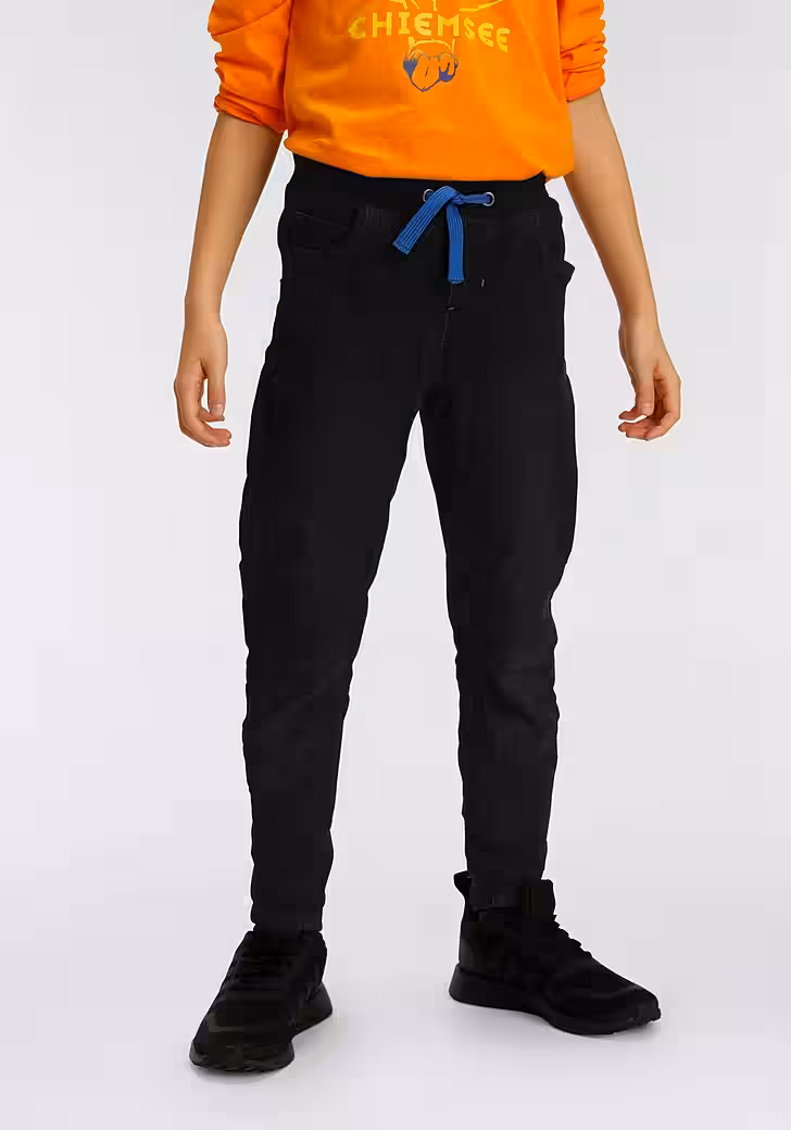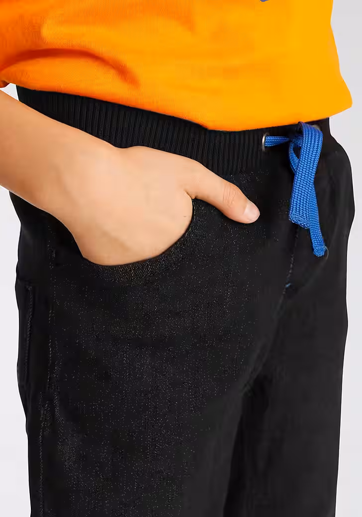 - Elastic ribbed knit waistband with drawstring for an individual fit