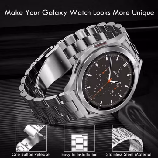 Give your Samsung Galaxy Watch a stylish look with this elegant stainless steel strap . The high-quality stainless steel material impresses with its durability and modern design – perfect for everyday wear, business, and special occasions.