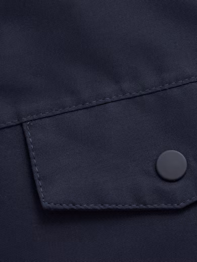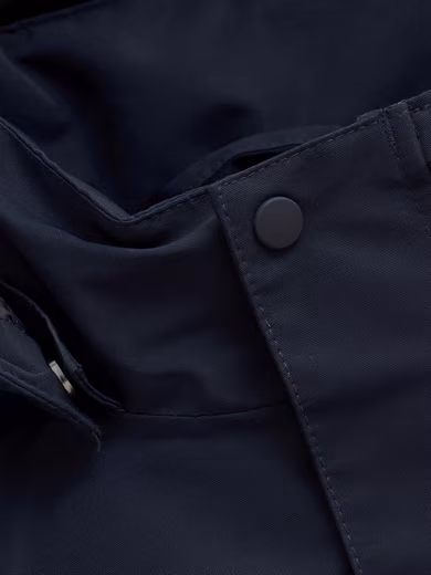 • detachable hood with snap fasteners around the fleece-lined collar
