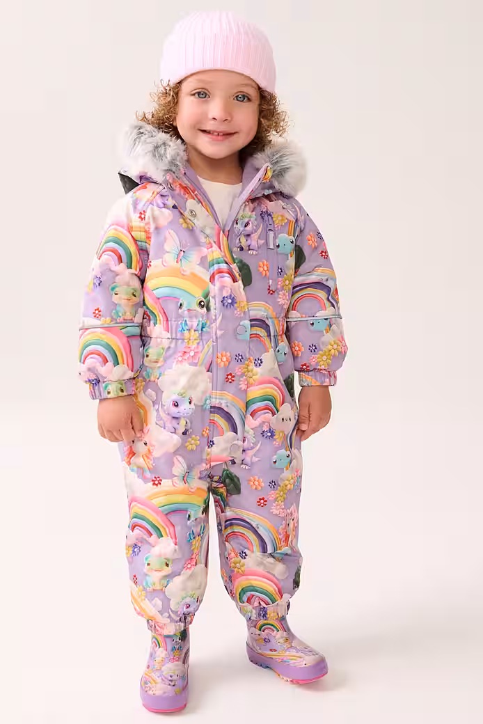 In this cozy one-piece suit, your little one will stay comfortably warm in winter. The waterproof quilted design has sealed seams and a hood with faux fur trim.