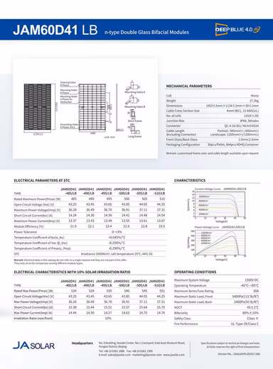 The JA Solar JAM60D41 LB is a high-performance bifacial double-glass solar module with a nominal output of 500 Wp, designed for the highest energy yields and maximum durability. Thanks to the innovative n-type Bycium+ cell technology and the 16-busbar half-cell configuration, it offers outstanding efficiency and minimal power losses.