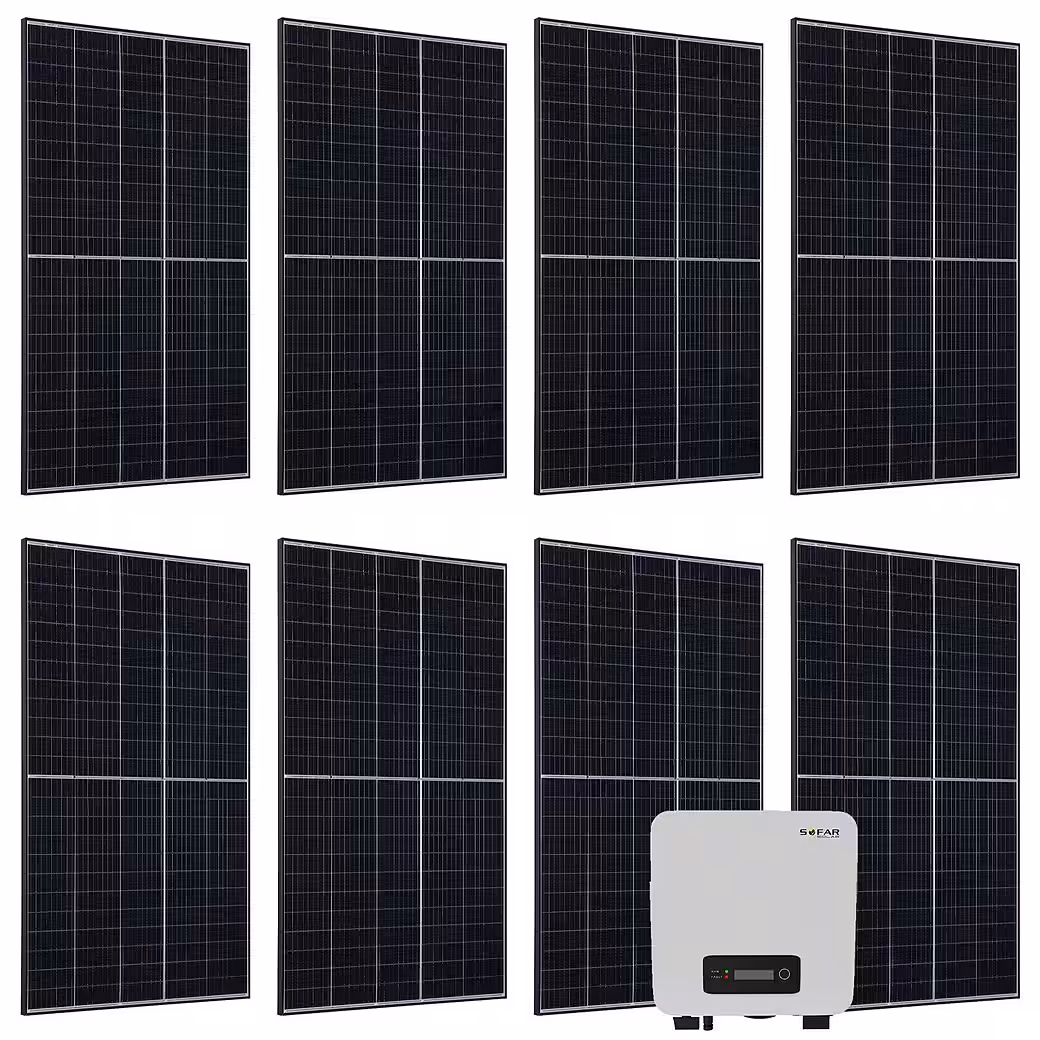 Set includes 8 x RISEN solar modules RSM40-8-410M, 1 x SofarSolar inverter 3000TL-G3, 1 x set of MC4 connectors, 1 x Wi-Fi dongle, 1 x instruction manual