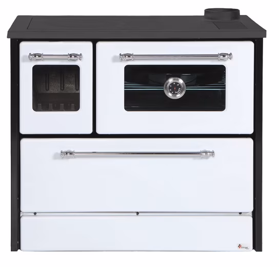 We would like to take this opportunity to introduce you to the Küchenhexe 701-G Omega. This design classic among kitchen ranges will impress you with its outstanding presence. The expressive, beautiful fire panorama captures the moment in an alluring way, as the state-of-the-art and safe combustion chamber technology, along with the integrated airwash system, ensures a clear view of the dancing flames for a long time. Cooking and heating simultaneously – this problem is solved in an elegant, practical, and efficient way: Thanks to a spacious, enameled oven compartment and the large cooktop, you can cook or bake a variety of dishes independently of electricity or gas. The built-in oven thermometer allows you to always monitor the optimal baking temperature. Anything is possible: you can fry eggs, cook stews, heat a kettle, or simply warm up or keep warm mulled wine for a winter celebration on the cast-iron cooktop. In the oven compartment, you can prepare delicious casseroles and bake pizzas, bread, or rolls, for example. A baking tray and oven rack are included. The oven compartment floor can be removed to allow cleaning of the flue vents beneath the oven. The spacious firebox is lined with solid cast iron plates. Elegant, chrome-plated towel rails and high-quality enameling on the front and sides complete the brilliant appearance. By removing the rings (for different pot sizes) in the cooktop, cooking can be done directly over the flame. The stove is suitable for shared chimney connections, as its firebox door is equipped with a tension spring (Type 1 design). Technical Data: – Nominal output: 9.18 kW – Efficiency: 79.82% – CO emission at 13% O2: 1204 mg/m³ – Particulate matter emission at 13% O2: 24.2 mg/m³ – NOx emission at 13% O2: 91.24 mg/m³ – OGC emission at 13% O2: 24 mg/m³ – Required chimney draft: 12.2 Pa – Flue gas mass flow: 8.1 g/s – Flue gas temperature: 225.37 °C – Flue pipe connection: 130 mm top right – Energy efficiency class: A – Appliance dimensions: Width = approx. 870 mm Depth = approx. 510 mm Height = approx. 790 mm – Oven dimensions approx.: Width = approx. 450 mm Depth = approx. 455 mm Height = approx. 175 mm Approximate combustion chamber dimensions: Width = approx. 180 mm (bottom) / 290 mm (top) Depth = approx. 360 mm (bottom) / 400 mm (top) Height = approx. 240 mm – External combustion air connection: not available (stove uses room air) – Weight: approx. 82 kg Safety clearance to combustible materials*: Minimum distance, in mm Side = 500 Rear = 500 Front = 1000 This stove naturally meets the requirements for installation in Germany (BImSchV Stage 2 as well as the strict local standards in Regensburg, Stuttgart, and Munich). A filter or other modifications are therefore not necessary. Please always consult your local chimney sweep before purchasing a fireplace.Have your chimney inspected for suitability before installing the fireplace. Always follow the operating and installation instructions and maintain the required safety distances. Have the fireplace inspected and approved by the district chimney sweep before its first use.