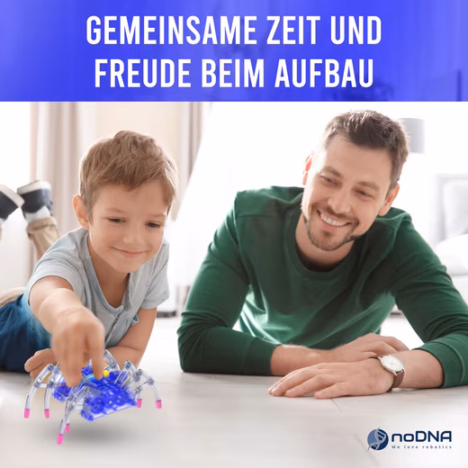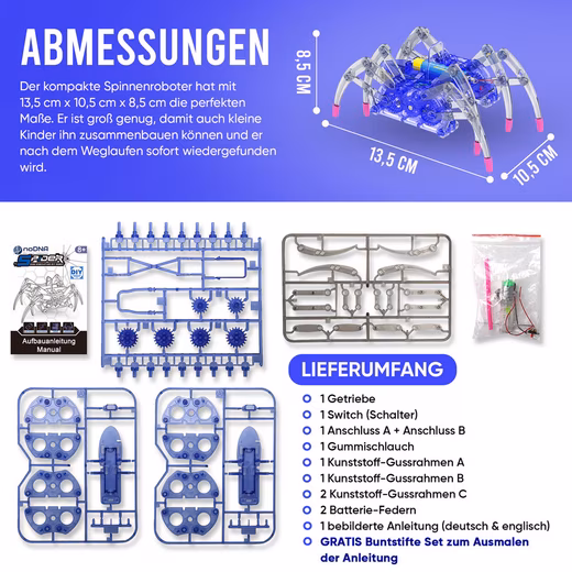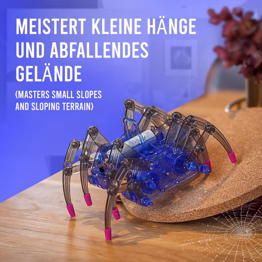 With the lively and easy-to-build Spider Bot, you and your children and/or grandchildren can experience the world of robotics in a playful and fascinating way. This cheeky DIY robot spider, with its eight multi-jointed legs, realistically imitates the walking motion of a real spider and crawls lifelike on any smooth surface. You have a choice of two assembly options to vary the stride length and gait. By equipping the spider’s legs with rubber grips (rubber tubes included), the machine can even navigate slopes and inclines. This mini-robot playfully introduces children to the world of robotics and allows them to learn the basics of STEM subjects (science, technology, engineering, mathematics) with this beginner-friendly and child-friendly device. A 6-page step-by-step instruction manual with pictures is included.