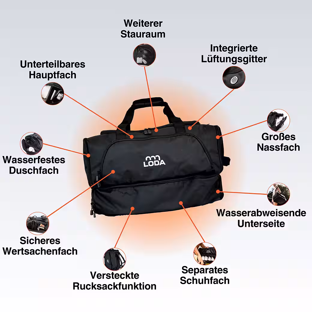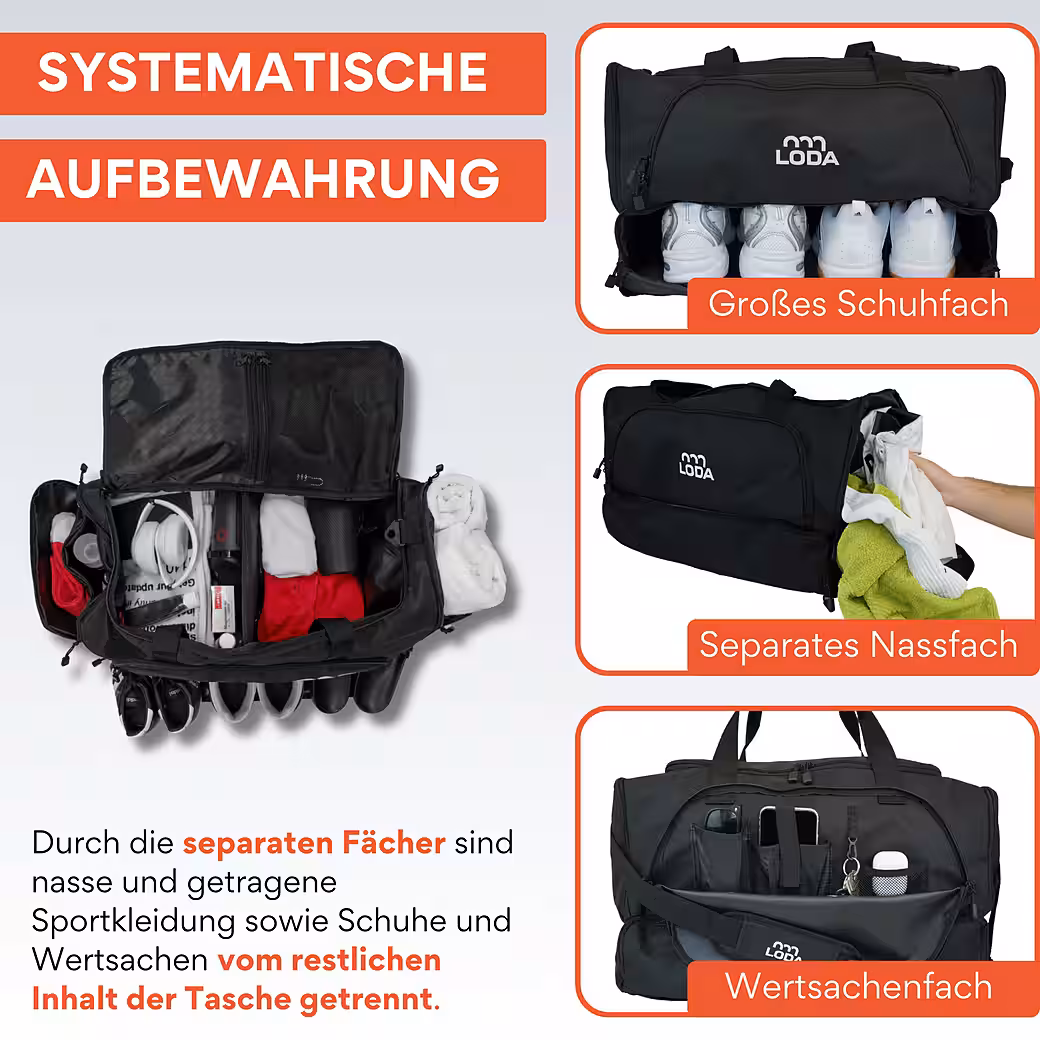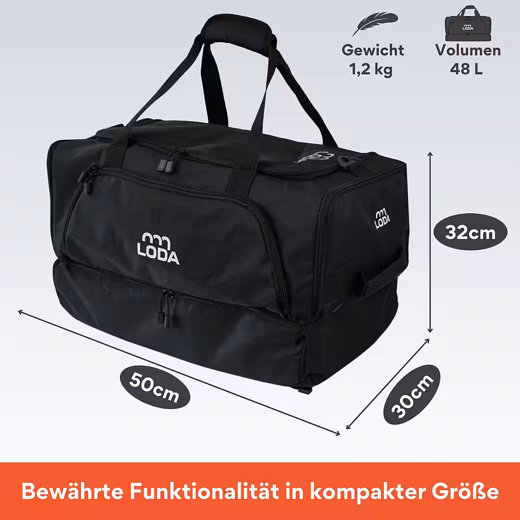 The LODA compact 48L is the perfect choice for anyone looking for a compact but thoughtfully equipped sports bag – without compromising on storage space or functionality. With its capacity of 48 liters, it offers exactly the right size for your daily training or for the next short trip. Whether gym, team sports or leisure – the LODA compact adapts flexibly to your active lifestyle. Despite its handy format, it surprises with clever features: the separate, ventilated shoe compartment can hold up to two pairs of shoes and keeps the rest of the contents hygienically clean, and a waterproof wet compartment ensures sweaty or wet clothes can be transported separately and safely – ideal after an intensive session or a visit to the swimming pool. The additional, waterproof shower compartment in which you can store shampoo, shower gel or care products in a clear and leak-proof manner is also practical and well thought out. Fleece-lined inner compartments are available for your valuables such as smartphones, glasses or keys – soft, protected and scratch-free. A real comfort highlight is the integrated backpack function: two padded shoulder straps can be folded out in no time so that you can carry the bag comfortably on your back –particularly practical on a bike, on public transport or on longer journeys to the sports field. Made from 100% durable polyester, the LODA compact is durable, easy to care for and ready for any challenge. With its compact dimensions of 50 x 30 x 32 cm, it can be easily stored in a locker, fits in any trunk and is also suitable for spontaneous short trips.