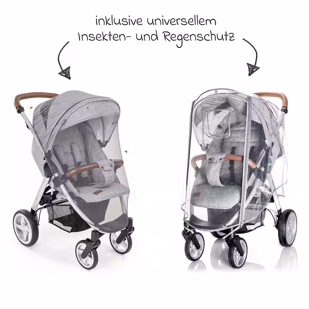 In rainy weather, a rain cover with a zippered front provides quick access without having to remove it completely. A ventilation window ensures a comfortable climate. In summer, a fine-mesh insect screen keeps mosquitoes away. Practical details such as the cup holder, the sturdy frame, maneuverable wheels, and the ergonomic push handle make the Eezefold DLX a reliable companion for daily commutes and weekend trips.