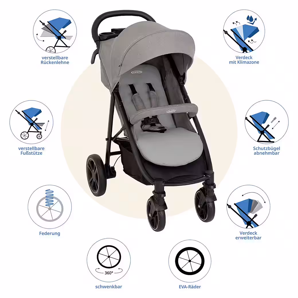 The Graco Eezefold DLX buggy and stroller set is designed for flexible family mobility. Thanks to its practical one-hand folding mechanism, the buggy folds up in seconds – ideal when you’re in a hurry or carrying your child. When folded, it stands stably and fits compactly in the trunk of a car.