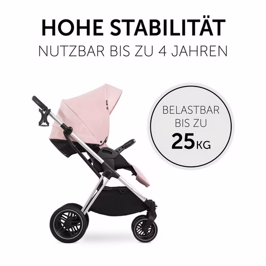 The seat unit rotates, allowing your child to face either you or the surroundings. With a weight capacity of up to 22 kg and a 3 kg storage basket, the stroller remains usable until approximately 4 years of age.