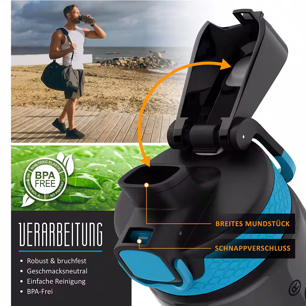 - CONVENIENT DRINKING: One-click opening with spring mechanism. Leak-proof thanks to silicone seal. Can be operated with one hand – ideal for sports.