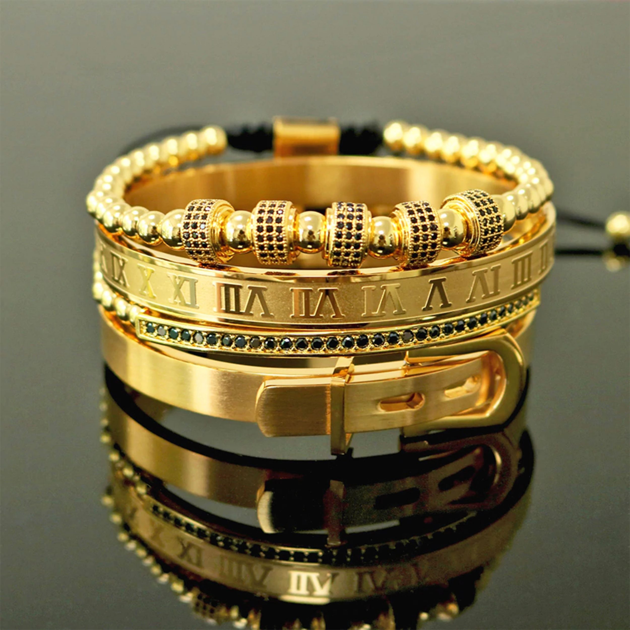 The IMPERIAL GOLD bracelet set impresses with the perfect combination of four elegant, 18k gold-plated bracelets. This set includes two adjustable bracelets made of copper beads and zirconia , offering sparkling shine and flexibility. The set is complemented by a stylish Roman numeral bracelet that embodies timeless elegance, as well as an elegant strap bracelet that adapts perfectly to your wrist.