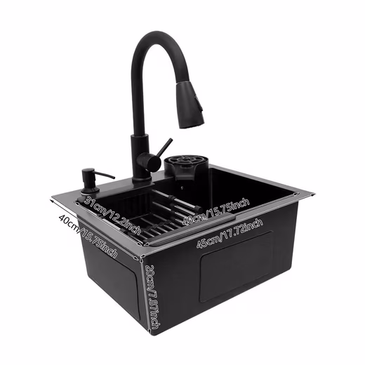 The multifunctional kitchen sink from Faizee Home combines modern design with well-thought-out features and high everyday usability. The elegant black surface ensures a timeless look and blends harmoniously into modern kitchens.