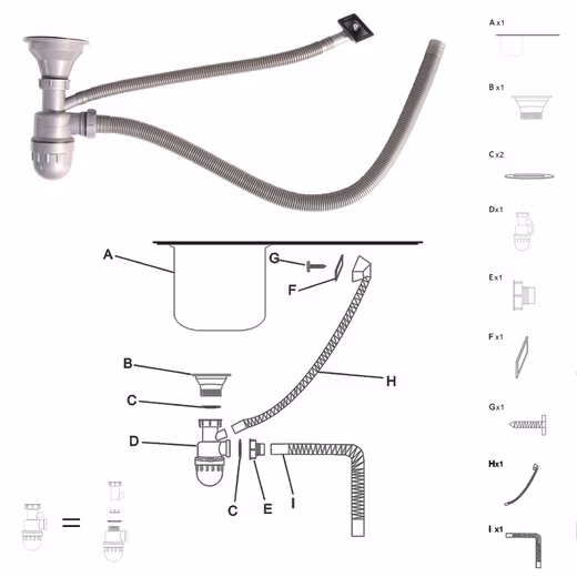 - Includes drain fitting and complete siphon (can be unscrewed for cleaning)