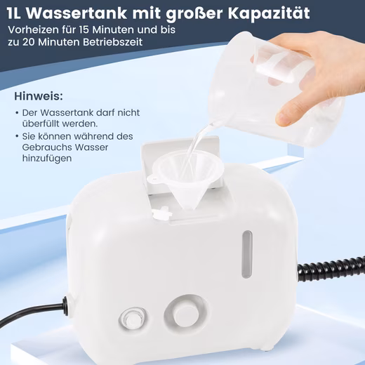 The 1500W portable steam cleaner offers a steam pressure of 3 bar and reaches a maximum temperature of 180°C for thorough cleaning. Equipped with a large 1L water tank, this household steam cleaner offers a working time of 30 minutes per filling, depending on the selected steam setting. You can adjust the steam settings according to your cleaning needs via a switch. And the clearly visible water level indicator makes it easy to monitor water consumption and the shoulder strap ensures comfort. With a 248 cm power cord, this steam cleaner is large enough to clean large areas.