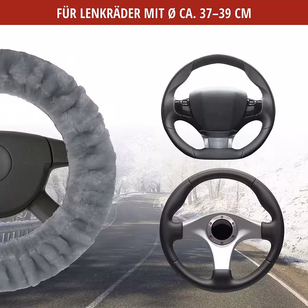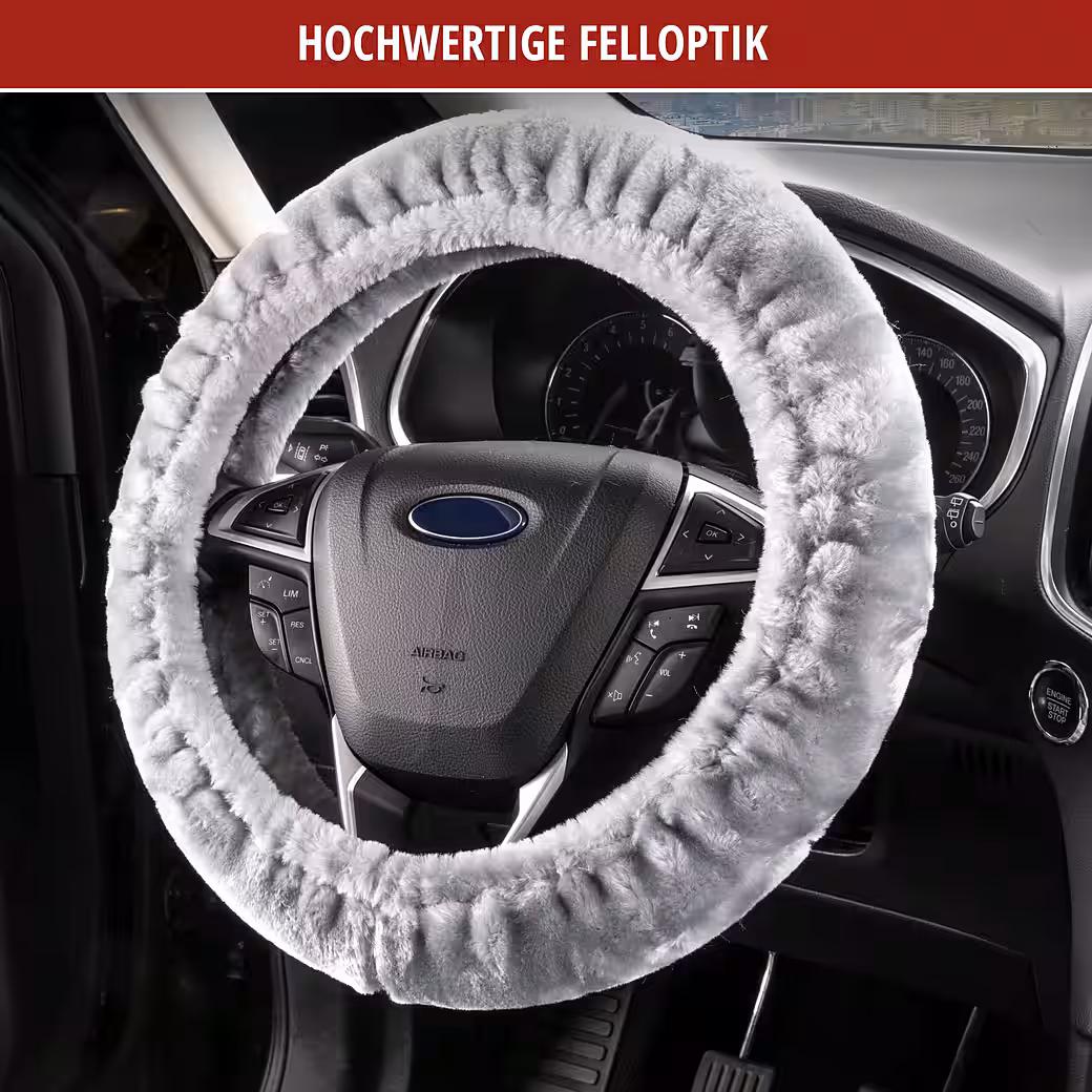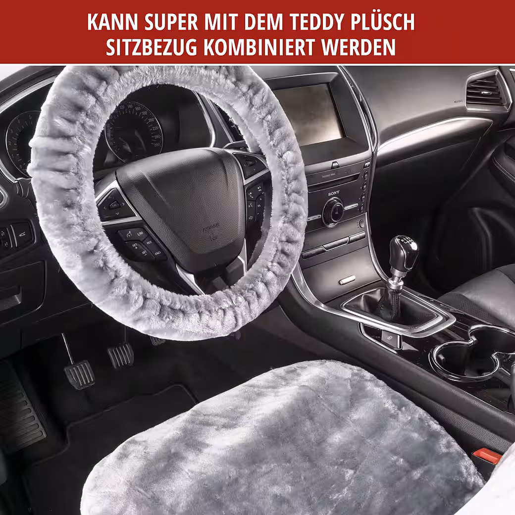 The plush, soft Teddy steering wheel cover in silver offers exceptional comfort and is distinguished by its wonderfully cuddly feel. Elasticated binding allows the cover to fit most steering wheels approximately 37-39 cm in diameter, making it suitable for most cars.