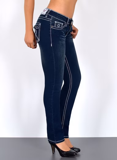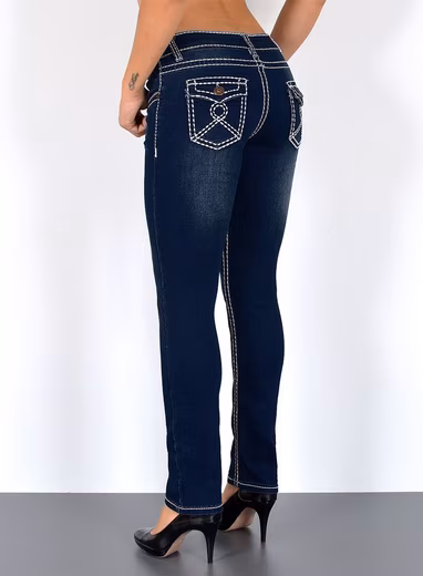 Our women’s straight fit jeans with a thick seam are characterized by their straight cut leg and perfectly fitting high-waist cut. The red and white seam on the straight cut jeans is unique and an eye-catcher. The women’s jeans with contrasting seams are timeless women’s jeans with a straight cut that are perfect for everyday wear. The high waist straight leg jeans make the trouser legs appear longer with their straight leg and fit perfectly thanks to the elastane content. Our women’s straight fit jeans with a thick seam / contrasting seams are a must for your wardrobe! High waist straight fit jeans with a thick seam up to plus size; straight fit jeans high waist with contrasting seams plus size; women’s straight cut jeans high waist with red and white seam large sizes; thick seams straight leg jeans women high waist plus size sizes; women’s straight leg jeans with white seams up to big size sizes; women’s straight jeans with white; jeans regular fit trousers. Contrast seams and high waist; high waist jeans straight with red / white seam. The straight cut jeans have a high waist and reach down to the waist. All women’s straight fit jeans are available up to plus sizes / large sizes 7XL. Trendy ESRA women’s straight jeans high waist available up to plus size / big size sizes. The special feature of these high waist straight jeans is the thick contrasting seams in red and white. Thanks to the high stretch quality, the women’s straight cut jeans fit perfectly and are comfortable to wear. The ESRA women’s straight leg jeans are not made in China! Made in Turkey; our sizes are German sizes. You can find other women’s straight fit jeans in the latest washes and fits among our other articles. Simply search for “ESRA Jeans”. You only pay shipping once, no matter how many items you buy from us.