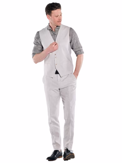 Light on the skin yet stylish in its appearance – this jacket and waistcoat made of high-quality linen blend fabric brings summer comfort to your wardrobe. Thanks to its light weight and subtle texture, it is pleasantly airy while exuding a sophisticated, masculine appeal. Whether worn with matching suit trousers or as a stylish contrast over a casual shirt – this piece is versatile and cuts a fine figure in every situation. A true highlight for men’s outfits, it effortlessly combines comfort and class – perfect for anyone who values high-quality men’s fashion with character.