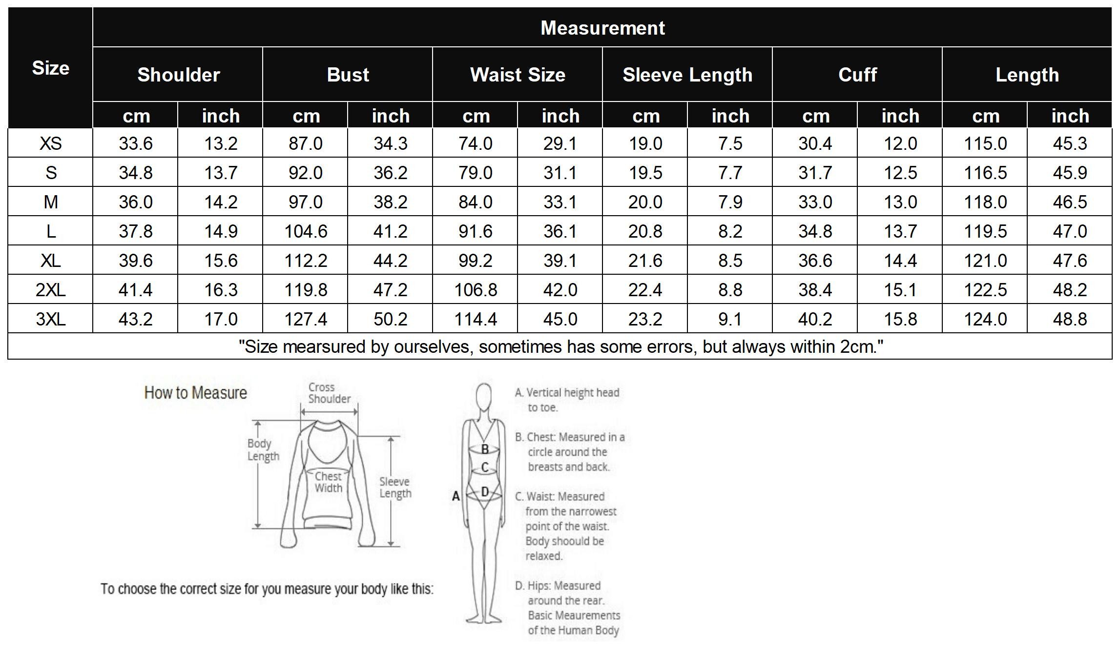 Please measure your body carefully and compare the measurements to the chart above. If you prefer a looser fit, we recommend choosing your normal size. If you prefer a slimmer fit, you might consider going down a size. Remember to make your decision carefully to ensure the best fit.
