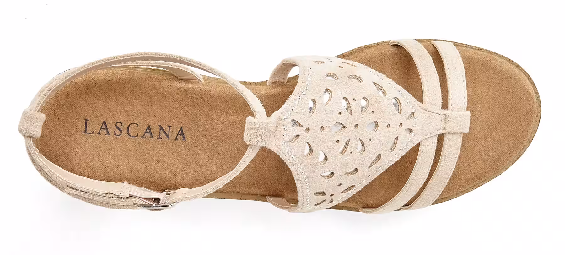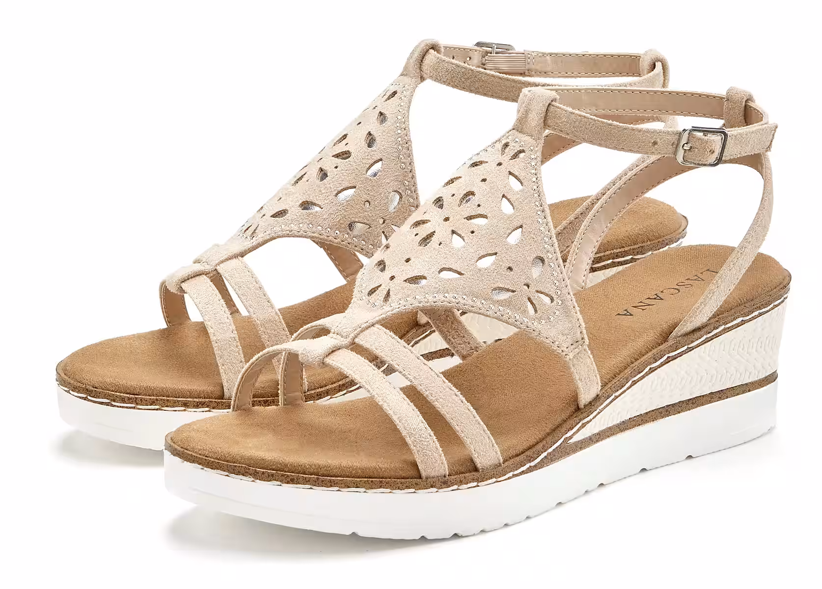 The sandal from Lascana is simply fun to wear! The suede look upper goes perfectly with the fashionable design of the women’s shoe. Simply a successful combination! You will also be impressed by the small metallic elements in the cut-outs and the comfortable wedge heel. Find your favorite summer dress from your wardrobe and wear it with passion with the beautiful shoes. The look is excellently underlined with matching accessories, such as trendy sunglasses. Fashion-conscious women can enjoy this sandal from Lascana every step of the way.