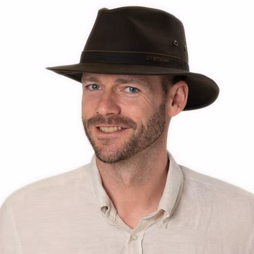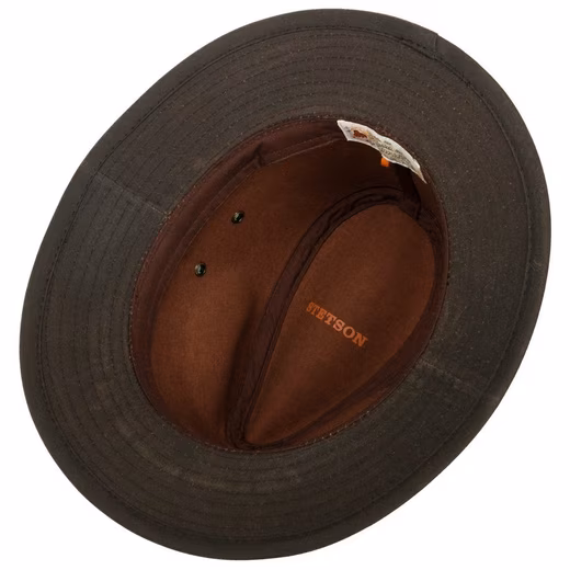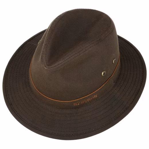 Waxed cotton, integrated UV protection, classic traveler shape and side air eyelets provide an outstanding overall package for the functional outdoor hat from Stetson. The contrasting colored piping and the brand lettering serve as visual highlights, while the fabric hat primarily focuses on protection against the weather and sun in particular. With untouched cotton lining band.