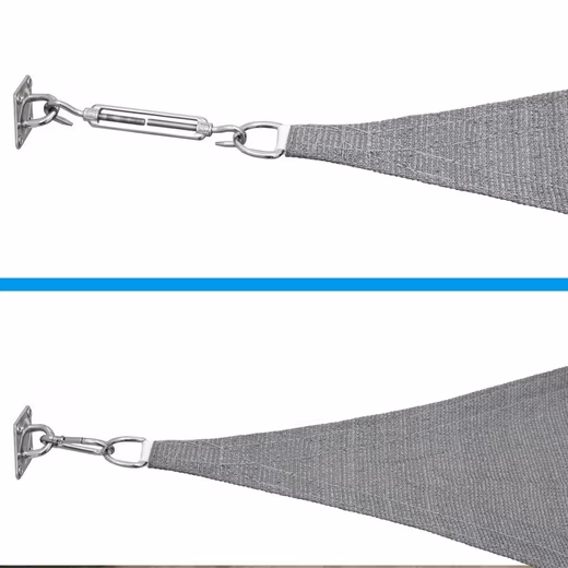 course, the roof can withstand a few drops. However, it is permeable during a downpour, so you won’t have any problems with water pooling. The sail should always be taken down during storms or thunderstorms. Included: Mounting kit for concrete, stone & wood – 2 professional turnbuckles – adjustable from 15 – 22 cm – 1 carabiner hook, approx. 3 x 6 cm – Material: 304 stainless steel – 3 heavy-duty wall hooks, approx. 4 x 6.5 cm – 12 screws, approx. 4.5 x 0.7 cm – 12 wall plugs, approx. 2.7 x 0.8 cm. Hook it on, tension it, done! 1. Hook the sail onto the first anchor point using the carabiner . 2. Then attach the turnbuckles to the sail and loosely hook them into the anchor points – do not tighten them yet . 3. Tighten the turnbuckles alternately until even tension is achieved.