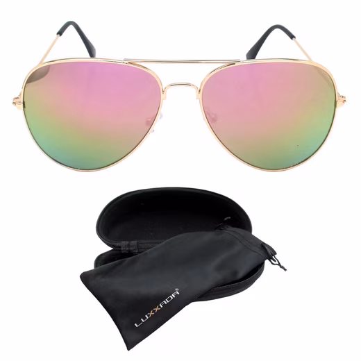 Retro pilot sunglasses for women and men made of lightweight metal with retro temple joints or with spring hinges and a black glasses bag with a hard case. The lens colors are available in either black polarized or pink and silver mirrored. These brand sunglasses from Rennec ® have a sturdy frame yet are lightweight and therefore comfortable to wear, even for many hours. The frame width is 136mm, and the glasses height is 50mm. The mirrored lenses are NOT polarized. Only the black lenses are polarized. The lens technology of the glasses is 100% UV 400 protection, polarized or mirrored in silver and pink. These UV400 lenses with their UV protection protect your eyes against the sun’s UV radiation up to 400 nanometers. The filter class / glare protection of the lenses is cat. 3