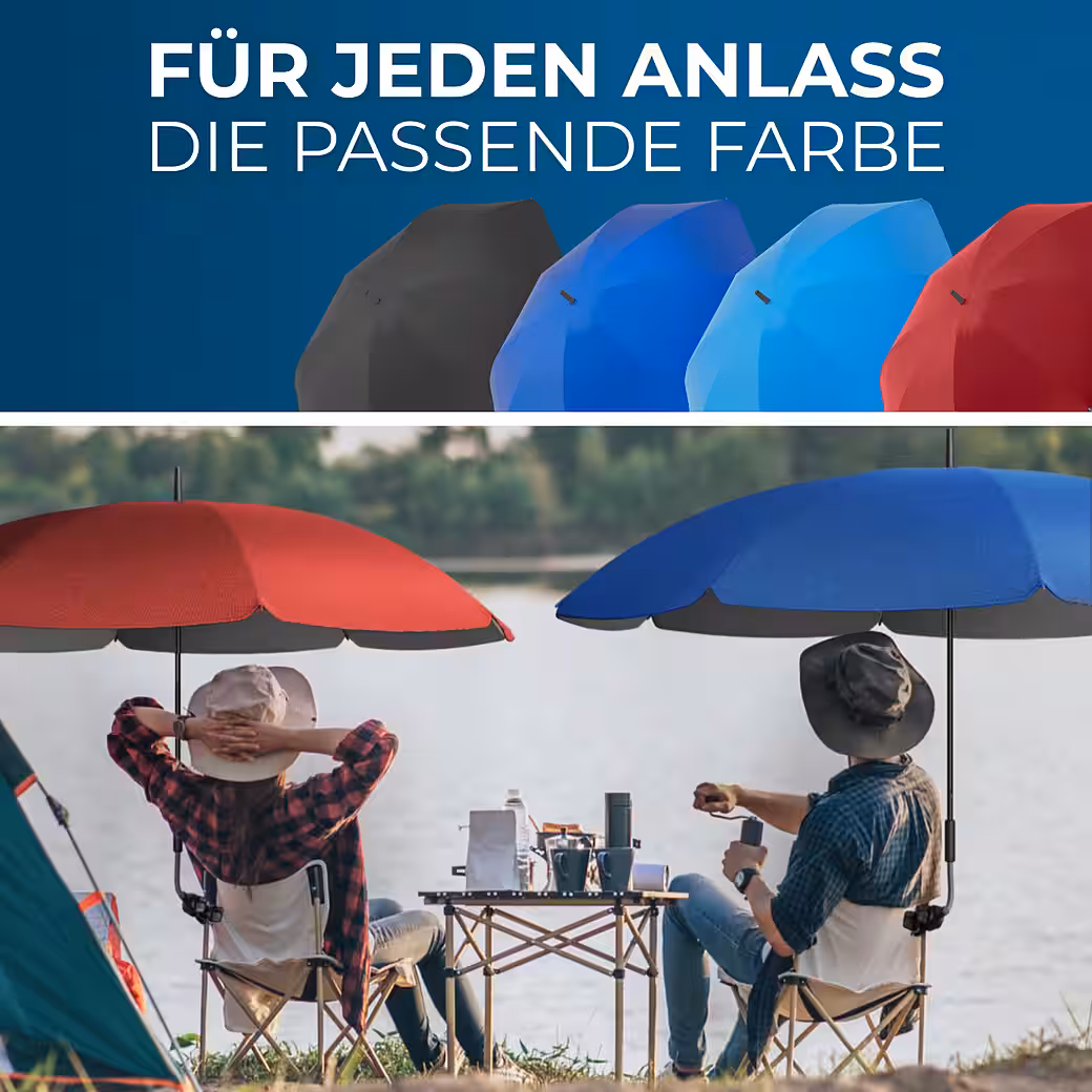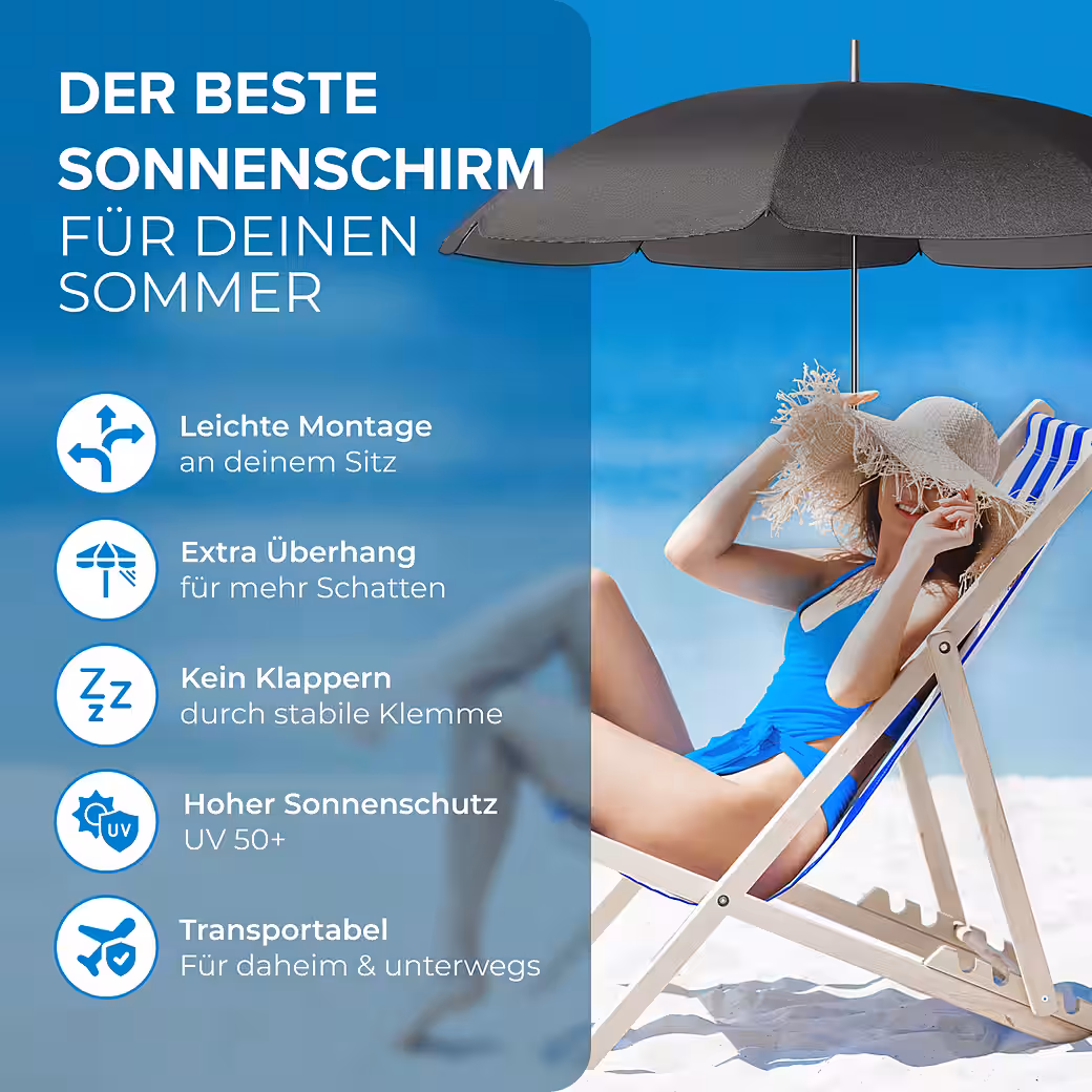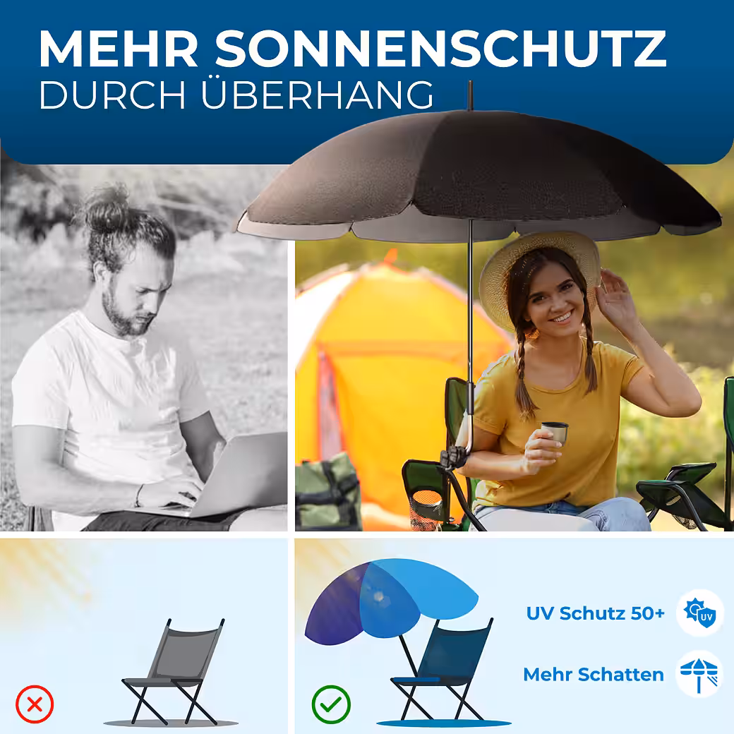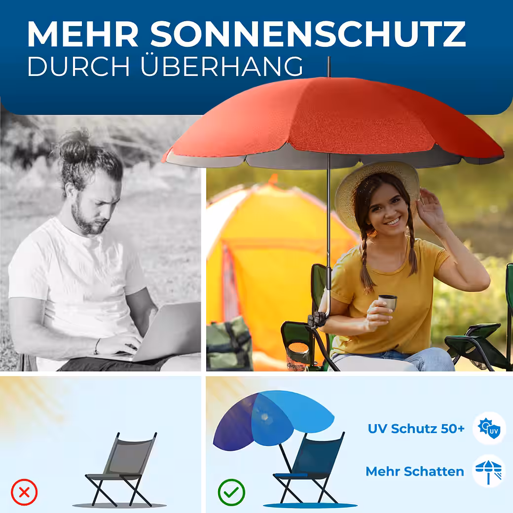 - WITH A HIGH-QUALITY CLAMP – A parasol with a clamp that holds securely anywhere! No matter the position of the sun, the parasol fits all camping chairs and is also suitable for balconies.