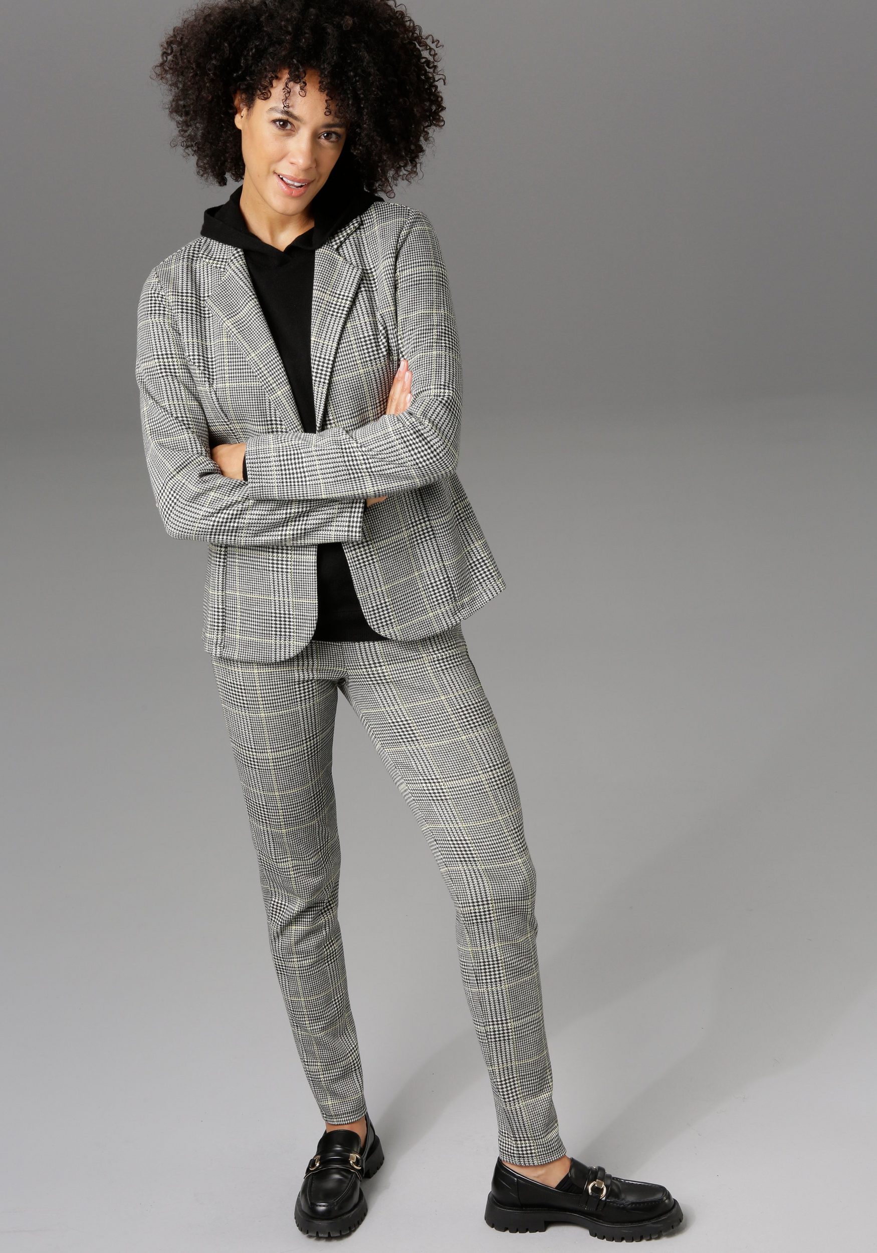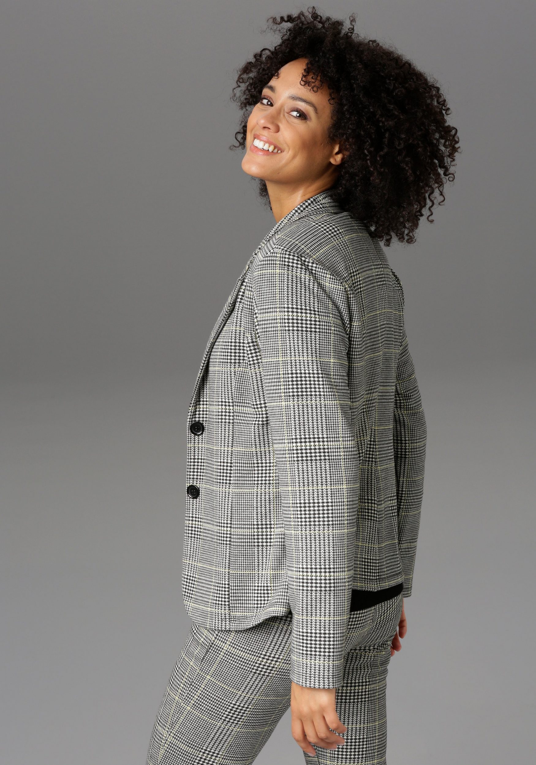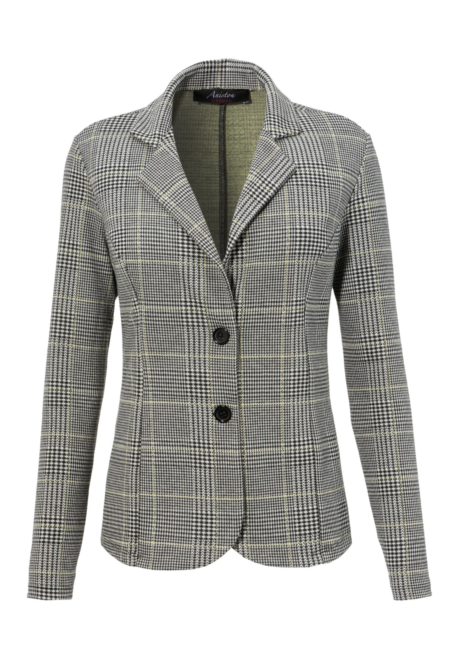 Trendy blazer by Aniston CASUAL. Featuring a checked pattern. Notch lapel collar. Two-button closure. Figure-hugging jersey blazer in jacquard fabric. Machine washable.