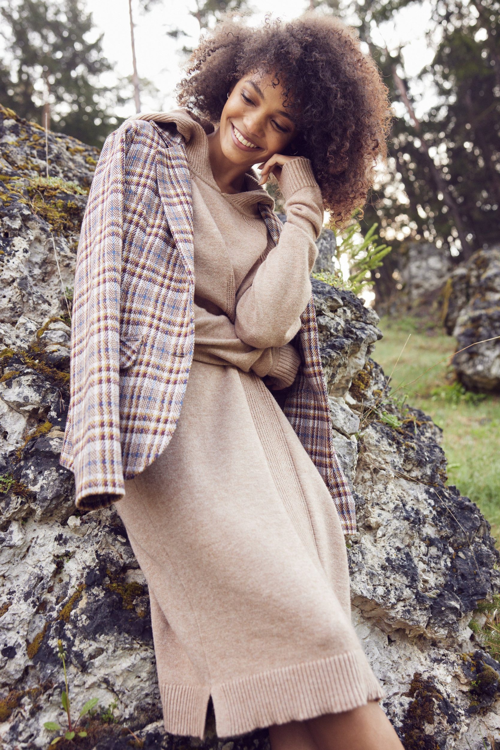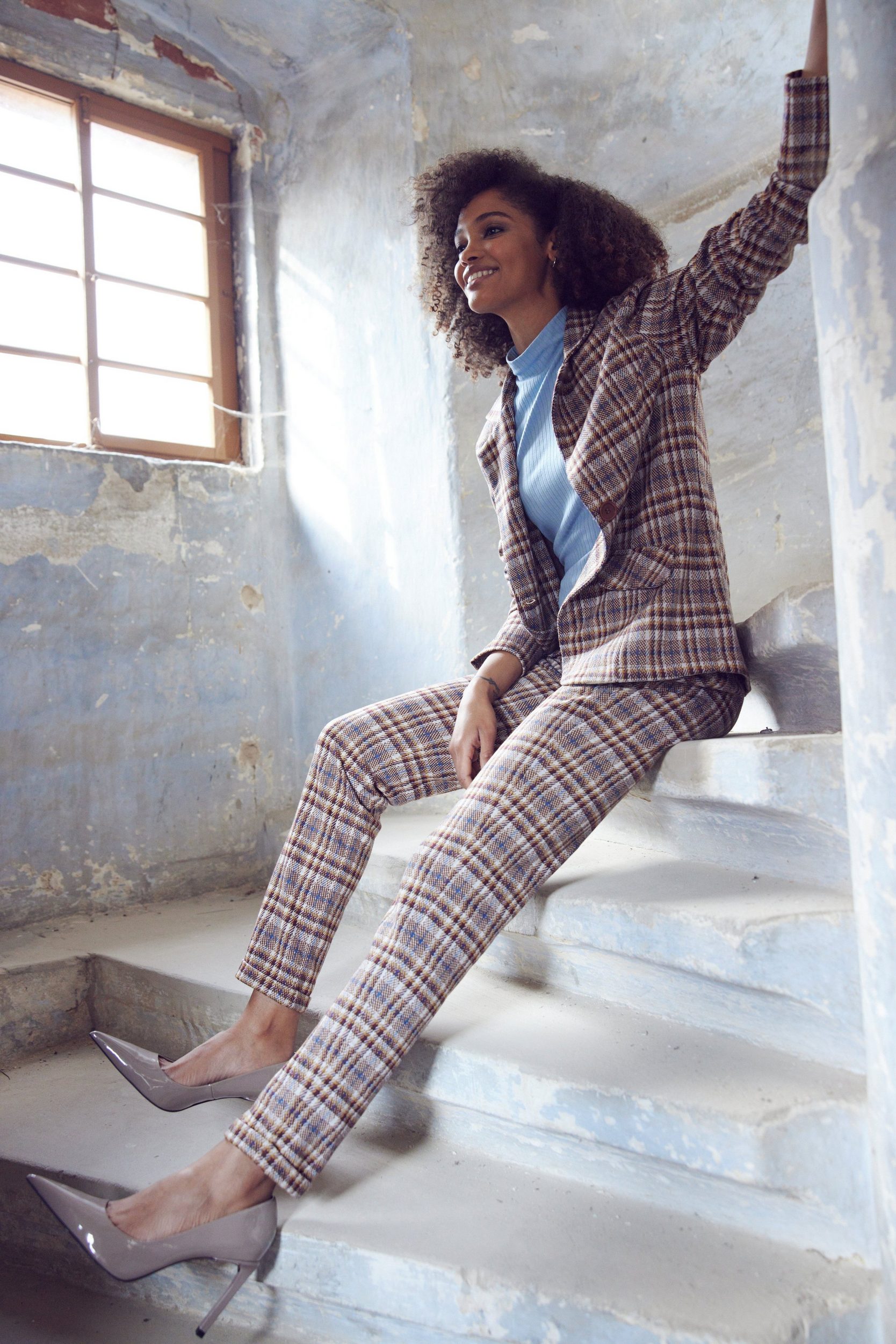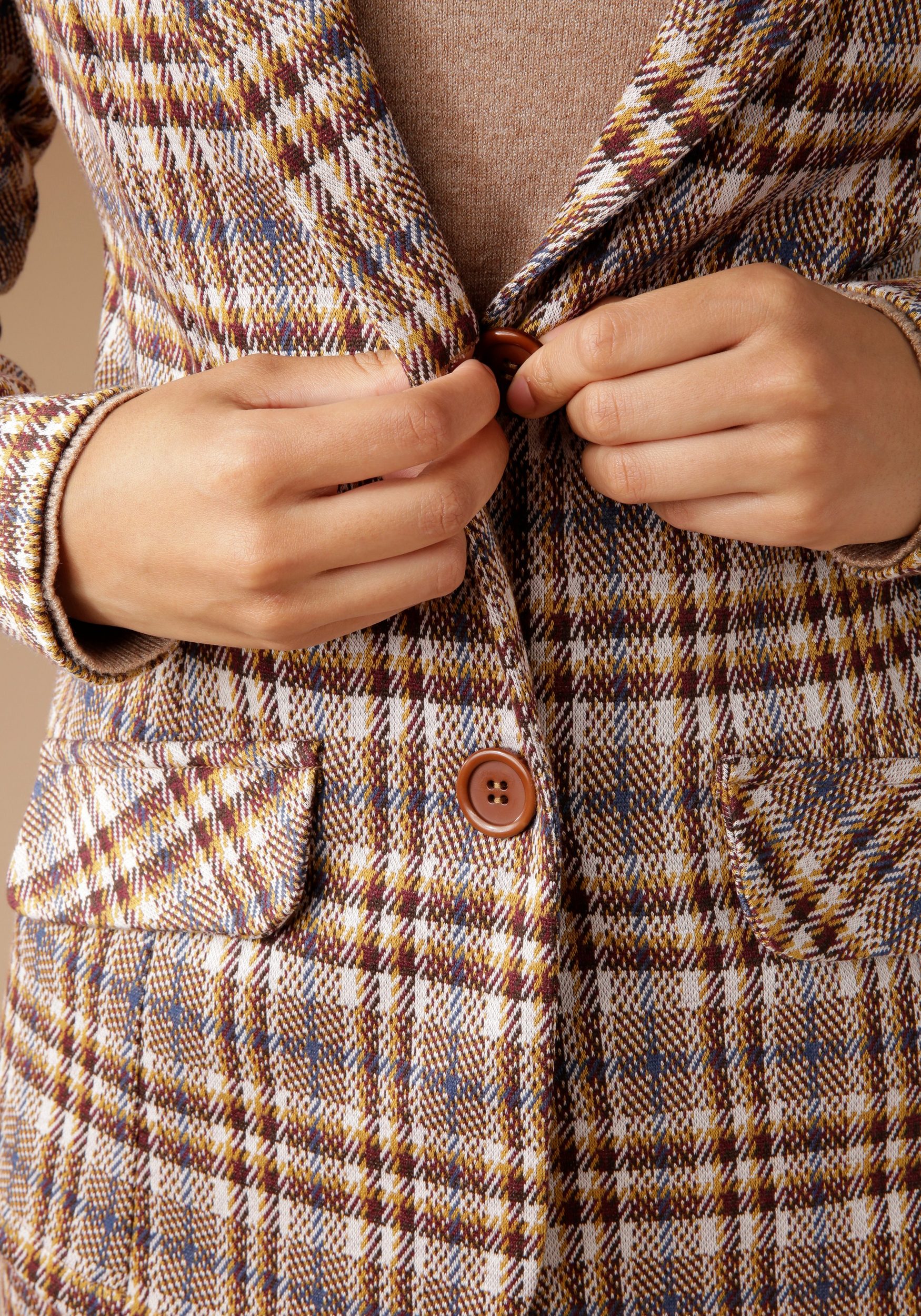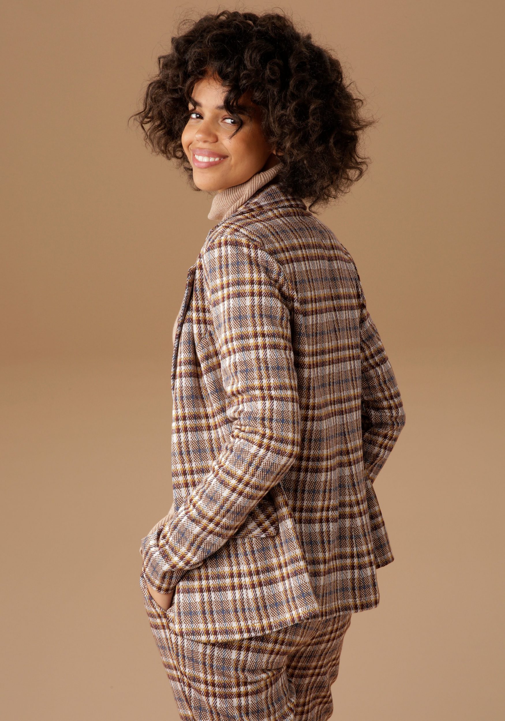 Sporty blazer by Aniston CASUAL. Trendy checked design. Lapel collar and two Falke pockets. Fastens with two buttons. Matching trousers are also available. Figure-hugging cut. Length in size 36 approx. 62 cm. Stretch jacquard fabric. Synthetic fiber. Machine washable.