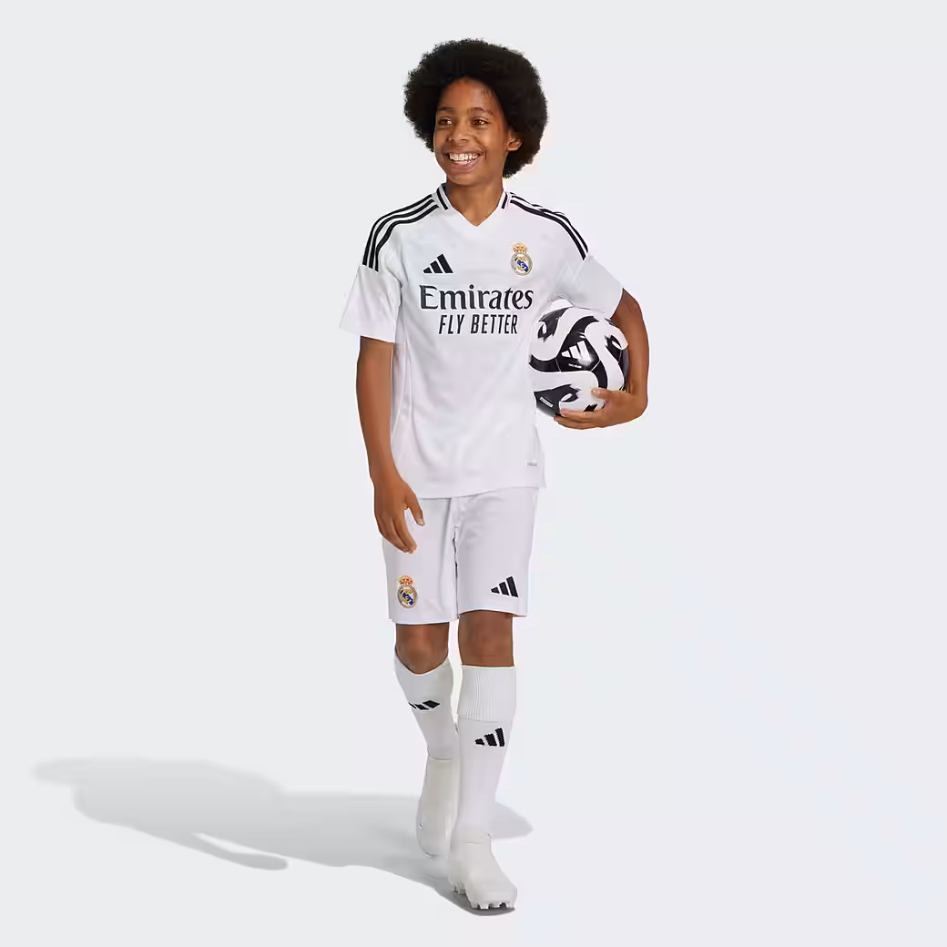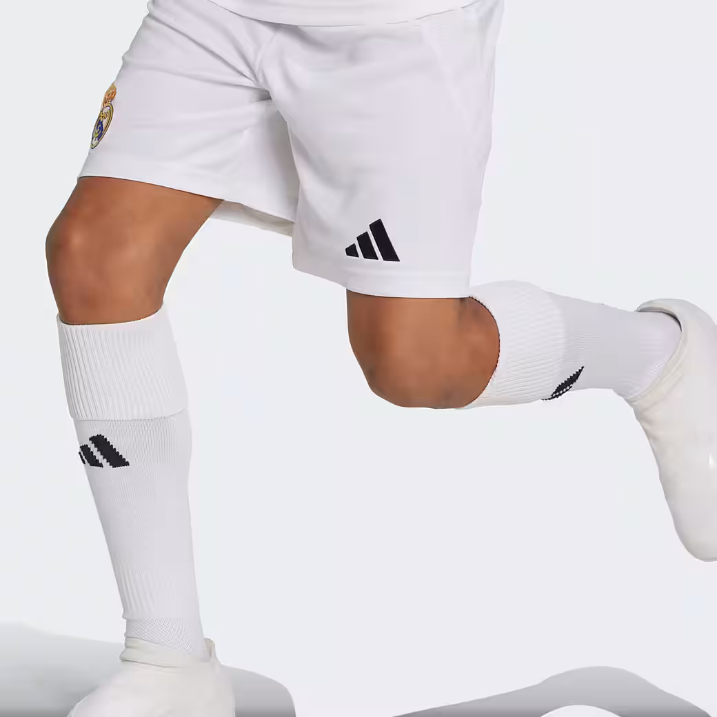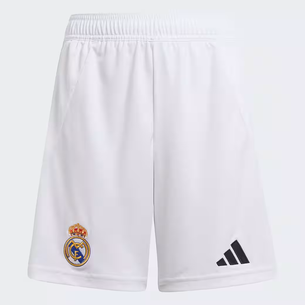With these adidas Real Madrid home shorts for kids and teens, you almost feel like the professionals are on the pitch at the home game at Bernabeu Stadium. They are part of the football equipment inspired by a Madrid tradition and come with an embroidered club logo. In addition, the moisture-absorbing AEROREADY technology ensures a pleasantly dry feel when kicking or cheering. This product is made with 100% recycled materials. Reusing pre-existing materials helps us reduce waste, limit our reliance on non-renewable resources, and reduce the CO2 footprint of our products.