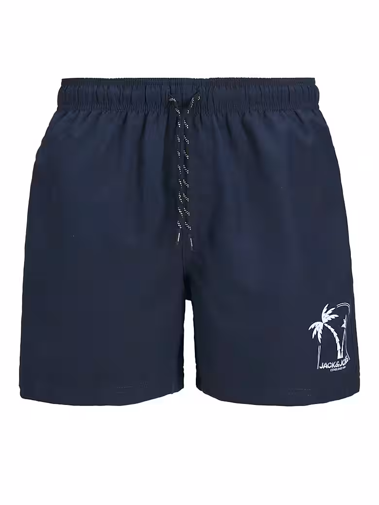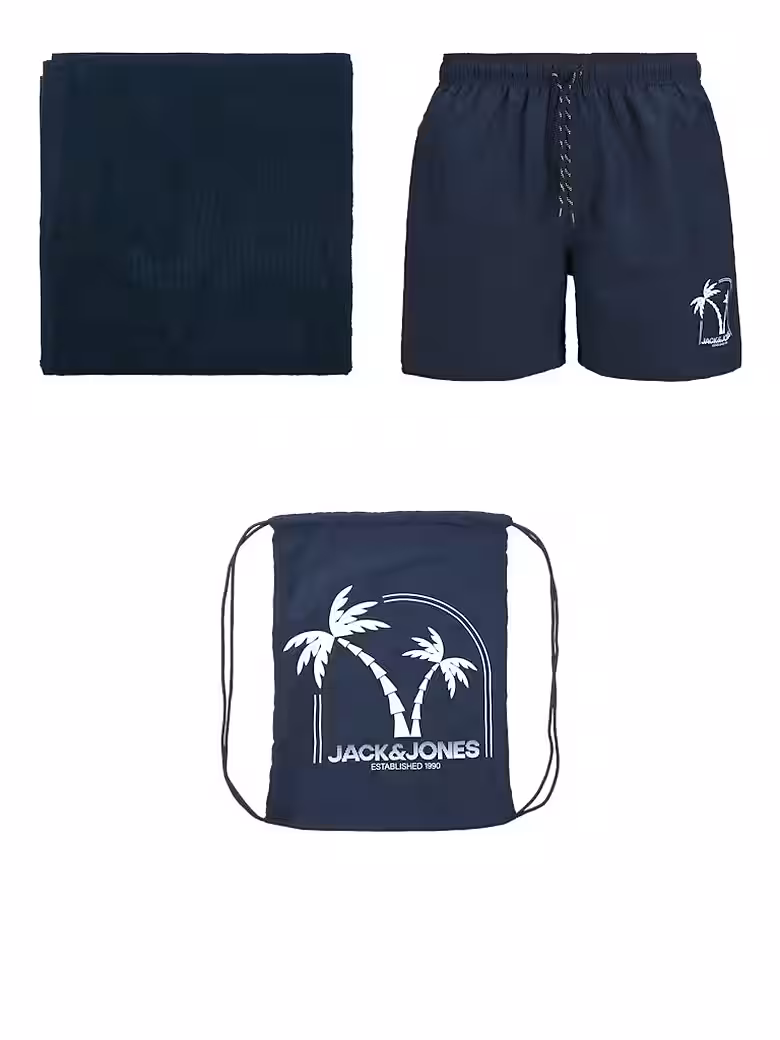With the JPSTMAUI bathing set from Jack&Jones Junior, your teenager has everything he needs to visit the swimming pool, swimming lake or beach. An elastic bathing resort, a large bath towel and the matching bag that he can carry like a backpack. All 3 things have the popular brand logo. This set is certainly a nice gift idea. Details: Bathing set/beach set consisting of a bathing hoard, bath towel, bath bag, elastic bathing hoard with elastic waistband and drawstring, side entry pockets, mesh inner trousers, brand logo print, towel size 70×139 cm woven brand logo, bag with drawstring and straps printed brand logo Material Body: 50% polyester, 50% recycled polyester; Lining: 100% polyester, towel: 100% cotton, bag: 100% polyester