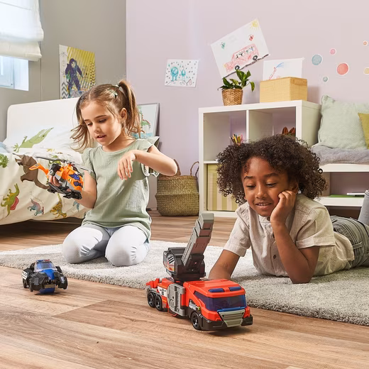 Master every adventure heroically with the 3-in-1 Super T-Rex! This cool T-Rex consists of three units that can be easily transformed into three rescue vehicles: a police car with an LCD screen and LED flashing lights, a fire truck with an extendable ladder, and a helicopter with a rotating propeller. It features two play modes: Dino Mode and Vehicle Mode. The vehicles can be easily reassembled into a single dinosaur. In both Dino and Police Car Modes, over 30 spoken phrases and sound effects are played. Seventeen points of articulation allow you to change the T-Rex’s pose. It also includes a volume control, a child-safe battery compartment, and an automatic shut-off function. Demo batteries are included. Requires 2 AA batteries.