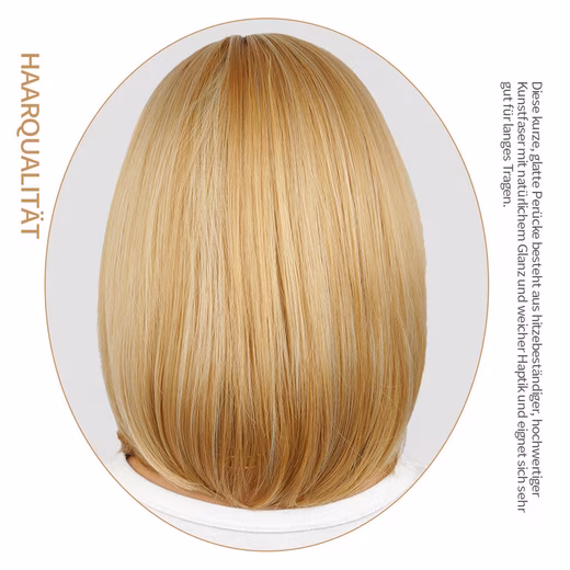 - This 30 cm long wig in a short haircut with straight bangs impresses with an elegant color mix of gold and honey brown tones as well as a straight fringe.
