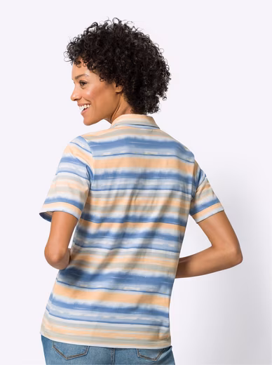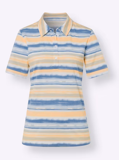 This polo shirt combines a sporty look with a harmonious striped pattern and skin-friendly single jersey fabric. It features a short button placket and short sleeves.