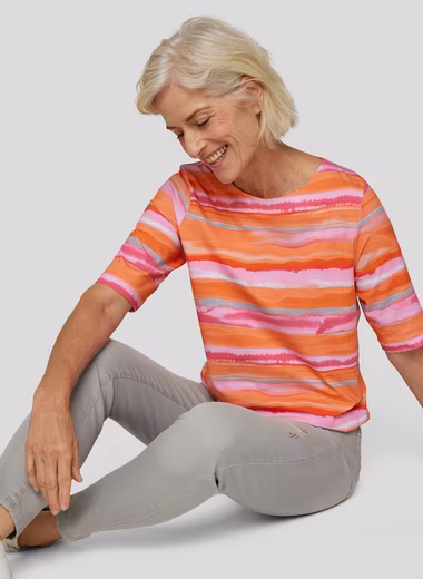 Take a closer look at Rabe’s T-shirt . This shirt features a boat neck, a waist-covering silhouette, and a basic cut that subtly showcases your upper body.