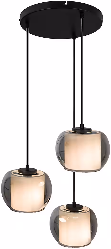 - The 3-spot pendant light has a diameter of 46 cm, a total height of approximately 120 cm, and glass shades have a diameter of approximately 20 cm.