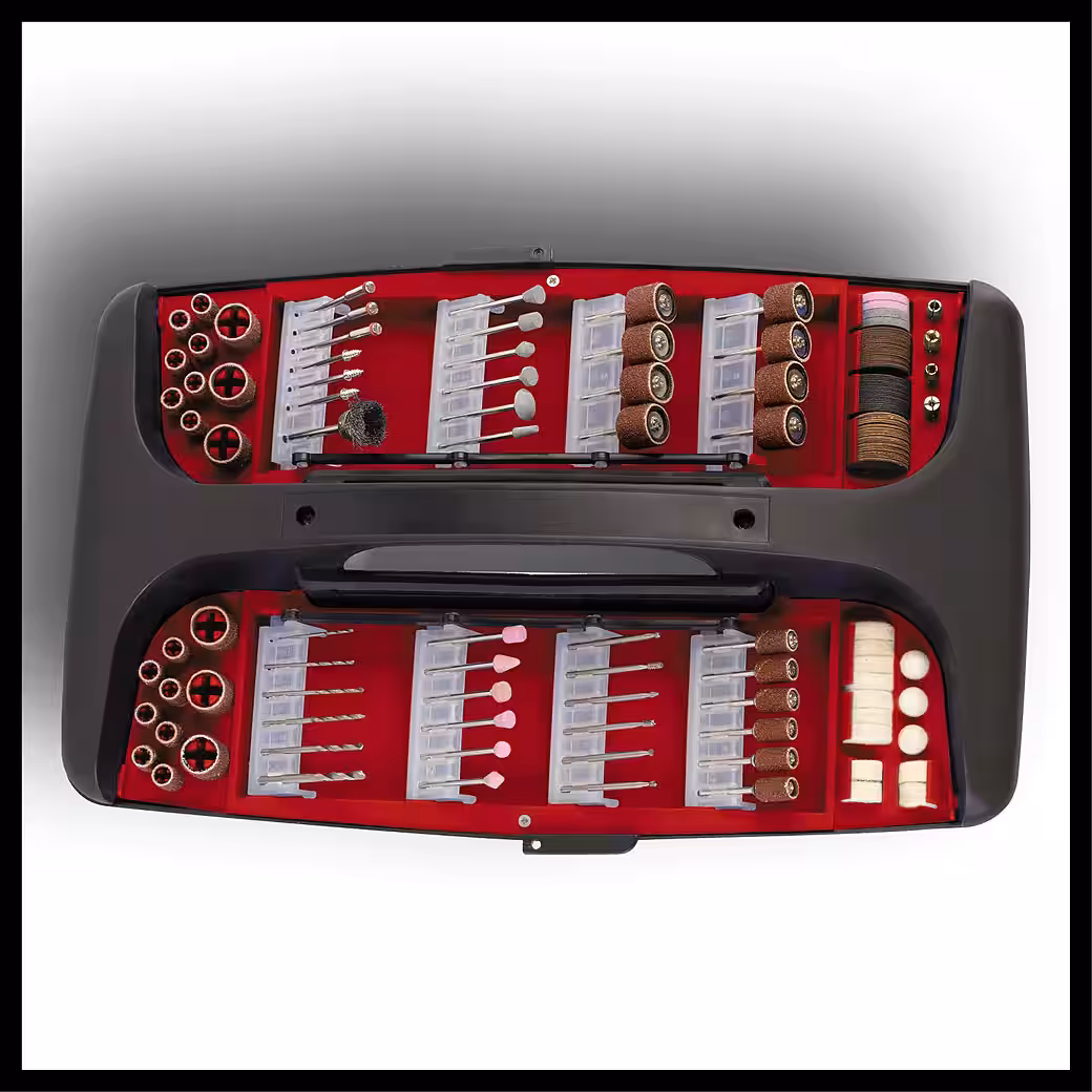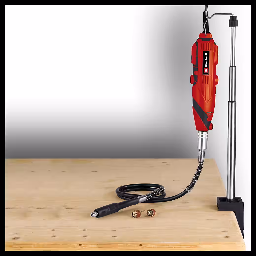 The TC-MG 135 E grinding and engraving tool is a high-quality, compact device that offers a wide range of applications for drilling, milling, grinding, and brushing thanks to its extensive accessories. The spindle lock allows for quick and easy changing of the various attachments. Its electronic speed control ensures smooth start-up and enables precise adjustment of the power to the specific task. The TC-MG 135 E features a flexible shaft, allowing for precise and easy work on various parts of the workpiece. The telescopic stand and accompanying hook allow for convenient tool mounting during operation. Thanks to its soft grip and ergonomic design, the tool fits comfortably in the hand. The comprehensive 189-piece accessory set for grinding, drilling, milling, and much more is also included and is conveniently stored in a carrying case. Scope of delivery: Grinding and engraving tool, 1x telescopic stand, 1x holder for telescopic stand, 1x wrench, 1x wrench for drive shaft fastening, 1x flexible shaft (1m), 6x drill bits (Ø 1-3mm), 4x chrome-plated collets (Ø 0.5/1.6/2.4/3.2mm), 12x assorted grinding wheels, 6x HSS milling cutters, 3x mandrels for felt discs, 3x mandrels for discs, 6x grinding shafts, 8x grinding shafts, 1x wire brush holder, 20x small sanding belts, 14x large sanding belts, 20x cutting discs, 20x cutting discs, 2x grinding wheels (silicon carbide), 2x grinding wheels (aluminum oxide), 11x felt discs, 3x pointed felt discs, 46x sandpaper
