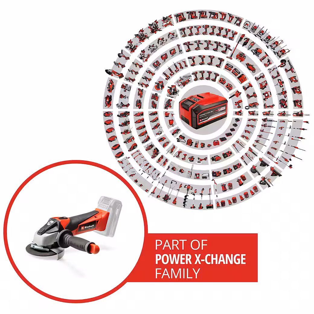 The Einhell TE-AG 18/115 Li-Solo cordless angle grinder is part of the Power X-Change series and can be operated with various battery sizes. The chosen battery determines the power and runtime of the Power X-Change tools.