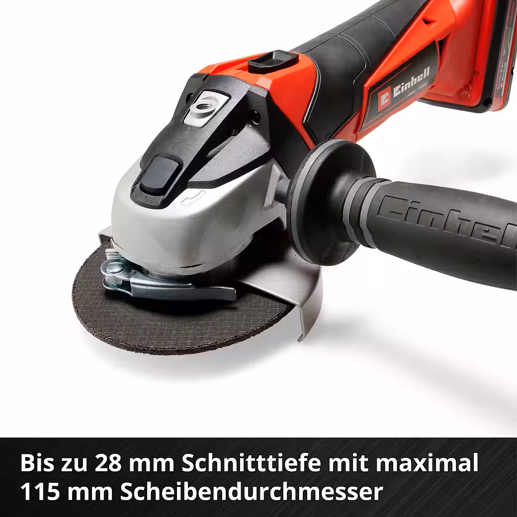 The Einhell TE-AG 18/115 Li cordless angle grinder (tool only) is the lightest angle grinder in its class and features a robust aluminum gearbox housing. As a member of the Power X-Change family, its batteries, with their high-quality lithium-ion cells, are compatible with all other Power X-Change products. The battery and charger are available separately, for example, as a powerful starter set. For optimal cutting, grinding, or roughing results, a 2.5 Ah battery or higher is recommended. A soft start function ensures smooth operation, while restart protection enhances user safety. The slim design with an ergonomic soft grip and a three-position adjustable auxiliary handle allows for comfortable handling. The redesigned airflow ensures optimal cooling and protects the gearbox. The quick-adjust disc guard can be adapted to any task in no time. Overload protection provides increased safety and durability. Cutting disc not included.