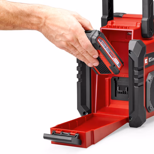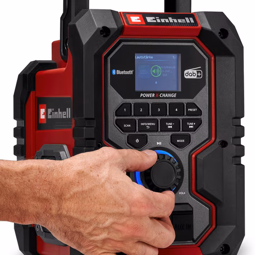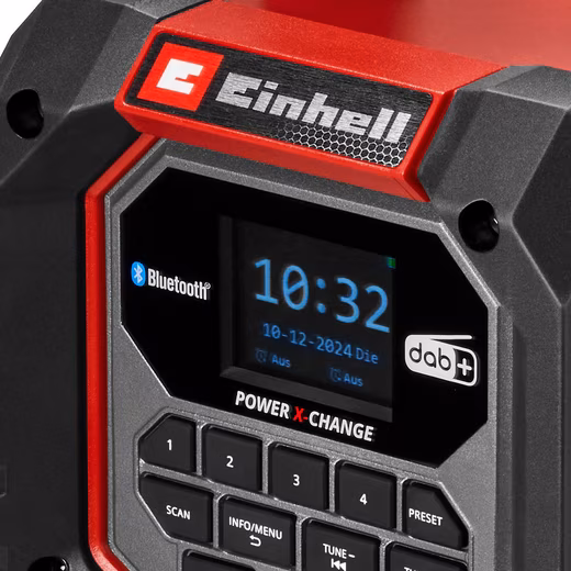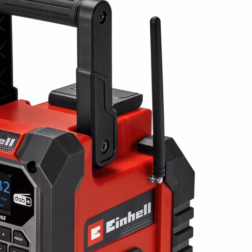 The Einhell battery radio TE-CR 18 Li DAB+/FM/BT – Solo is the must-have for a good mood on the construction site. The robust radio is a member of the Power X-Change family, in which all batteries, chargers and system devices can be flexibly combined with one another. Alternatively, it can also be operated via the included 1.8 m long power cable. The battery construction site radio receives digital DAB+ as well as FM transmitters and provides storage space for 30 transmitters each, and an automatic search makes transmitter search easier, while the RDS function displays information such as song title, transmitter name and traffic information directly on the razor-sharp TFT color display. In addition to radio reception, the device can also play music via Bluetooth, USB and AUX. In addition, external devices such as a smartphone can be easily charged via the USB-out interface. The integrated equalizer allows you to fine-tune the ups and downs to create an individually tailored sound experience. The rugged case with softgrip frame and battery protection are certified by protection class IP65, making it dust – and jet-water-protected – ideal for demanding environments such as construction sites or outdoor use. Two large speakers ensure powerful stereo sound and the foldable, shockproof antenna guarantees optimal reception. An integrated alarm clock with two adjustable alarm times, a sleep function for automatic switch-off and a wide, foldable carrying handle ensure a high level of comfort. The Einhell battery radio TE-CR 18 Li DAB+/FM/BT – Solo comes without a battery or charger. These are available separately.